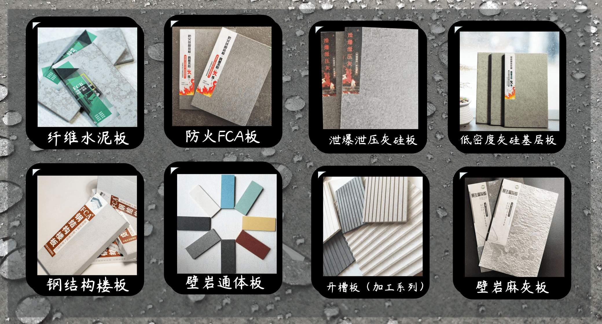 基礎板系列 天花板吊頂系列 玻鎂板系列 混凝土風格清水板系列 彩色通體壁巖板系列 特種用途板材系列 輕質隔墻板系列 玻鎂復合風管系列 被動式防火板系列 硅藻土系列